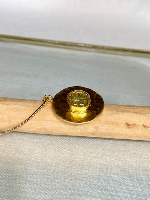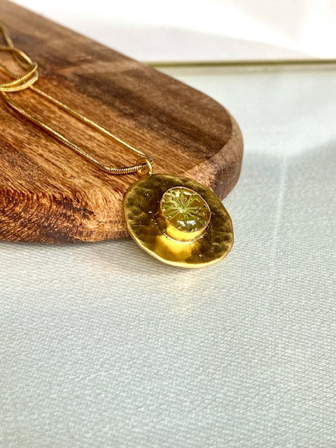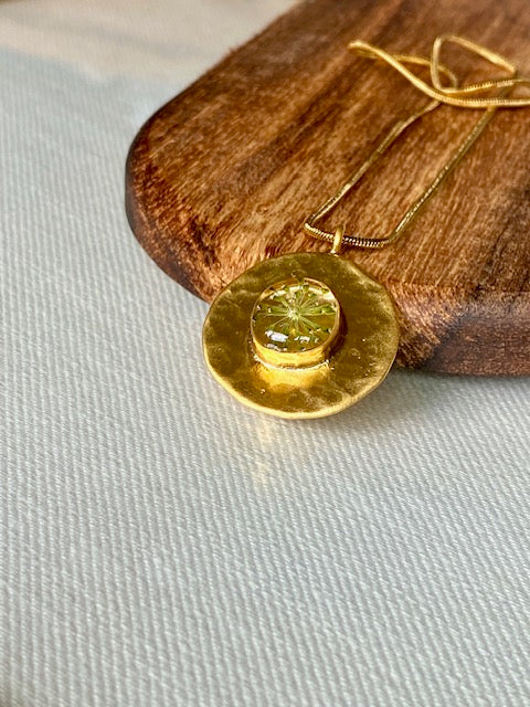 Deze unieke hanger (22k verguld brass) combineert de verfijnde symmetrie van karwijselie. In het midden ligt een natuurlijk zaadpatroon van de karwijselie, zorgvuldig geperst en gegoten in heldere kunsthars. Het fijne, stervormige design contrasteert prachtig met de warme gouden cirkel die een licht hamerslag-effect heeft.