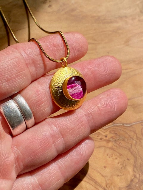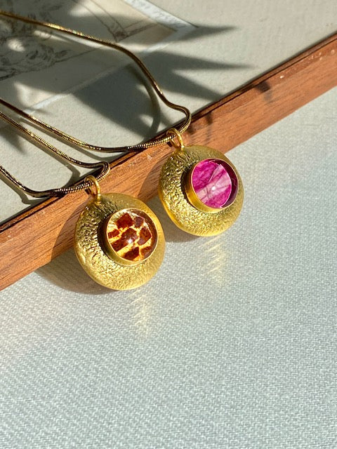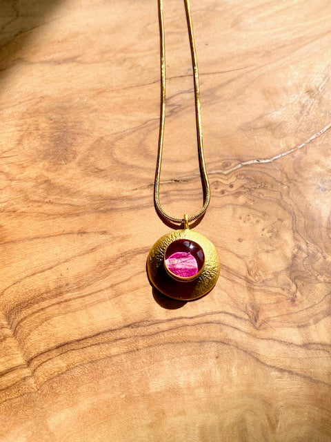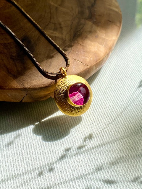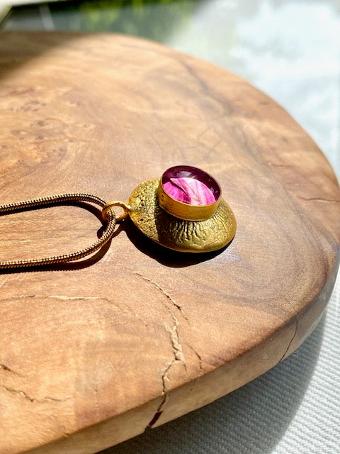 Deze vergulde hanger (22k goud op brass) bevat een echt rozenblad in twee tinten roze.