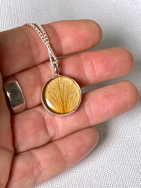 Beautiful silver-plated round pendant with a special detail of a dried rose leaf. With some rose leaves the original color disappears during the drying process and you are left with a beige-brown color, like here. Still just as beautiful with the beautiful lines of the leaf. The material is of very nice quality.