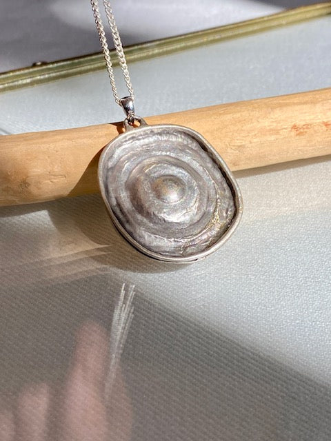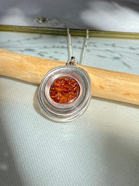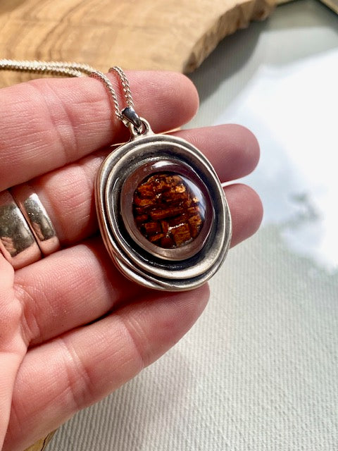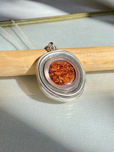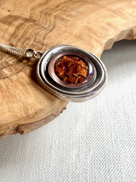 Deze grote verzilverde statement hanger is een uniek botanisch sieraad waarin een compositie van kleine stukjes Zweeds hout is verwerkt. De warme roodbruine tinten van het hout combineren prachtig met het zilver en geven de hanger een natuurlijke, aardse uitstraling. Elk stukje hout is zorgvuldig met de hand gesneden, waardoor de structuren en kleurnuances prachtig zichtbaar blijven.