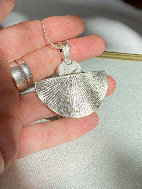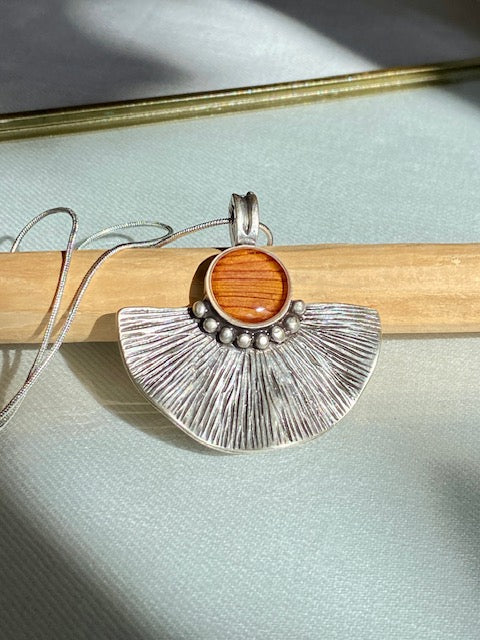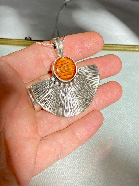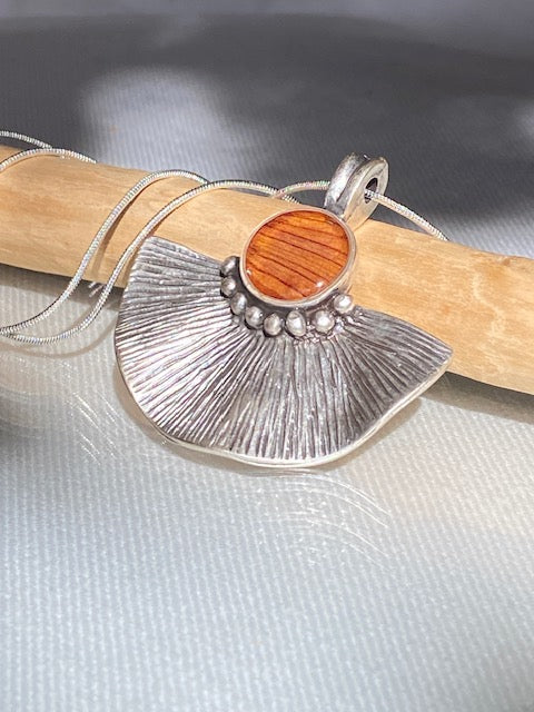 Deze grote verzilverde hanger is een uniek botanisch sieraad waarin een op maat gesneden detail van de trompetbloem is verwerkt. Het warme rood-oranje bloemblaadje vormt een prachtig contrast met het koele zilver. De fijne lijnen en natuurlijke structuur van de bloem zijn zorgvuldig behouden, waardoor de schoonheid van dit detail volledig tot zijn recht komt.
