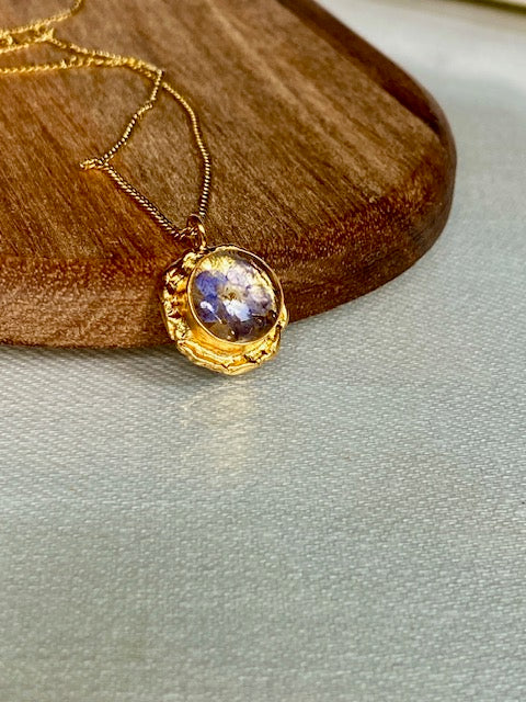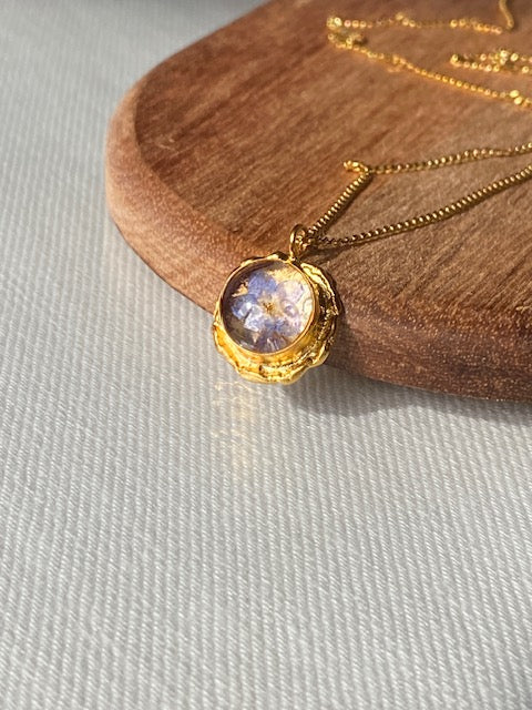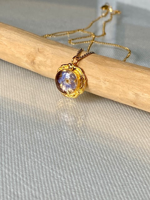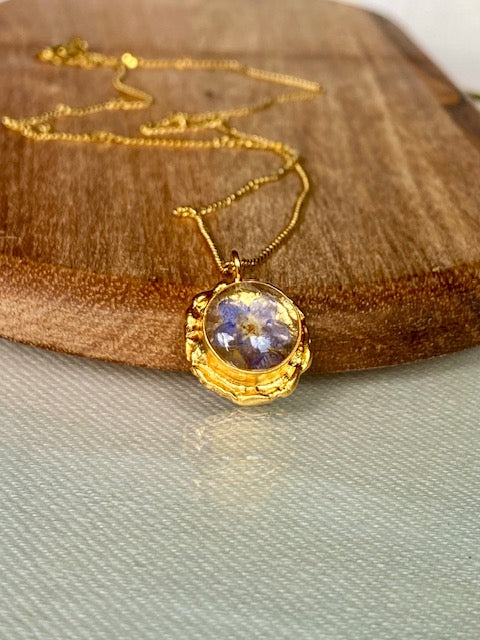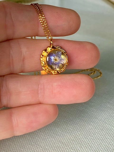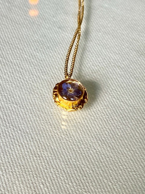 Deze verfijnde hanger is een ode aan de kwetsbaarheid en schoonheid van de natuur. In het midden van de 22k vergulde hanger zweeft een enkel blauw vergeet-mij-nietje. Zorgvuldig gevangen in meerdere lagen transparante kunsthars. Het bloemetje lijkt te zweven en straalt zachtheid uit, terwijl het goud subtiel door de bloem heen schittert.