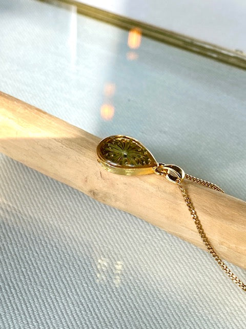 Deze verfijnde druppelhanger is gemaakt van 22k verguld brass en gevuld met een prachtig detail van de karwijselie, een schermbloem die na het bloeien zijn zaadstructuur achterlaat. De fijne lijnen en natuurlijke symmetrie geven de hanger een lichte, bijna grafische uitstraling.