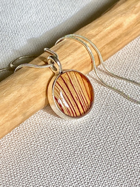 Het prachtig gestreepte bruin-oranje-rode detail in deze zilveren hanger komt van de gedroogde trompetbloem.